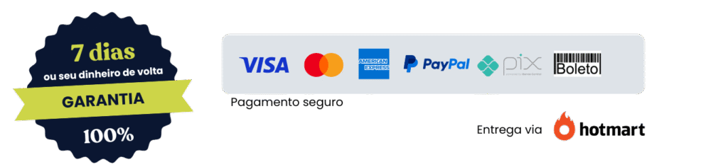Oferecemos diversas opções de pagamento: cartão de crédito (parcelado), boleto bancário, Pix e PayPal. Todo o processo de pagamento é seguro e gerenciado pela Hotmart, a maior plataforma de produtos digitais do Brasil.