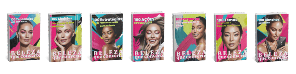 A coleção “Beleza que Converte” é um conjunto de 7 eBooks desenvolvidos especificamente para donos de salões de beleza e cabeleireiros. Ela inclui 100 tendências para 2025/2026, 100 ações e promoções, 100 temas para Reels, 100 principais perguntas do público no Google, 100 temas para stories, 100 mensagens para WhatsApp e 100 estratégias de relacionamento com o cliente.